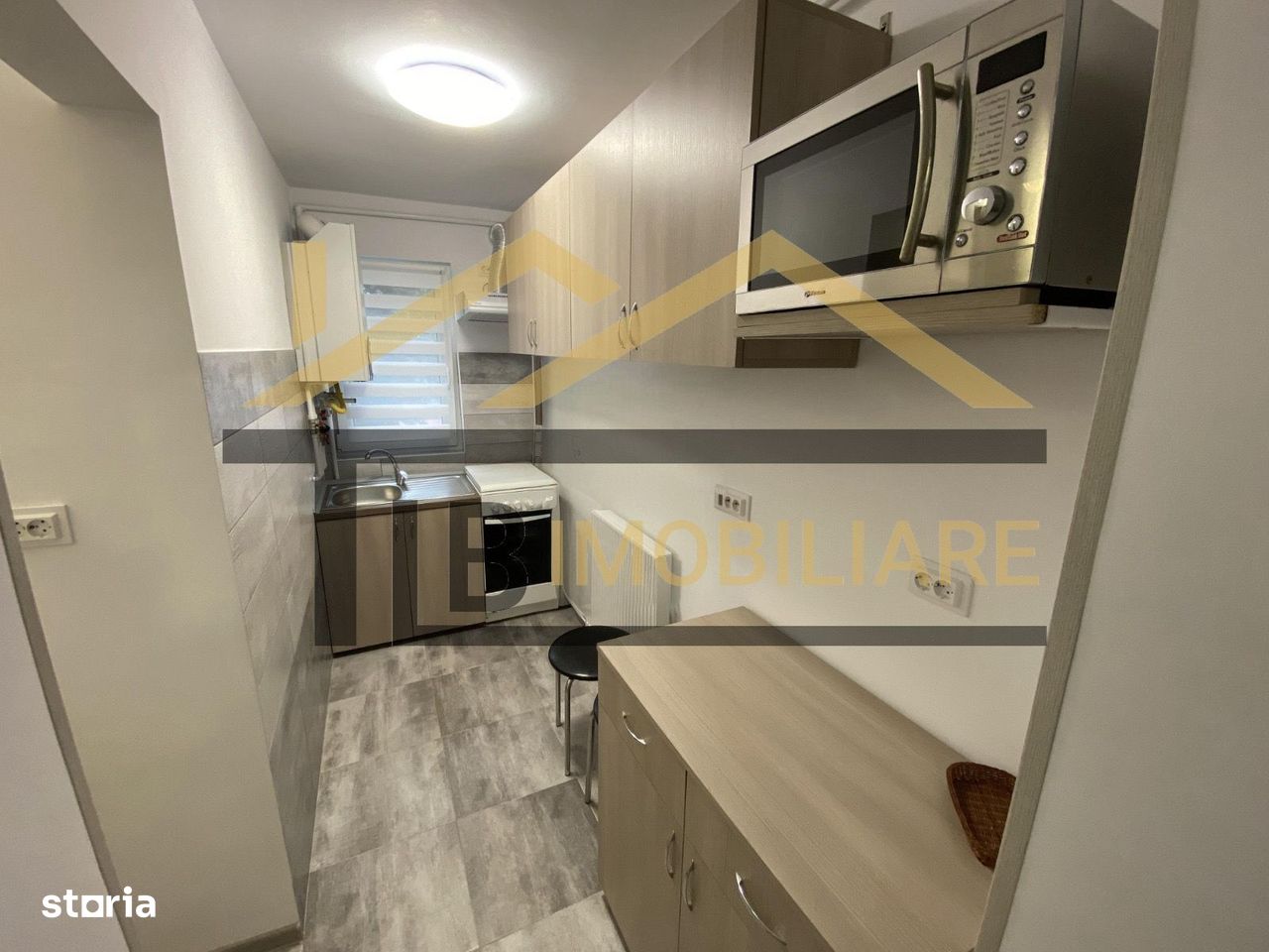 Se închiriază complet mobilat și utilat, fiind dotat cu aragaz, combină frigorifică, mașină de spălat rufe și cuptor cu microunde.