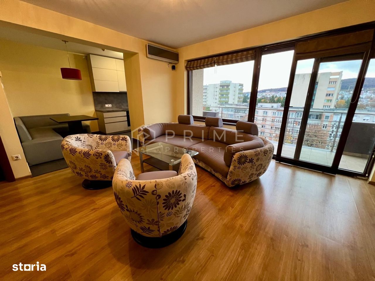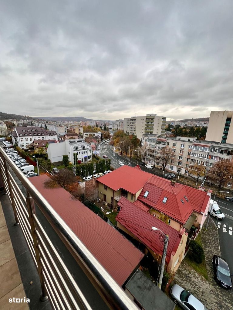 Balconul de 10 mp oferă o priveliște panoramică spectaculoasă asupra orașului și a zonei verzi din împrejurimi, creând un cadru ideal pentru momente de relaxare.