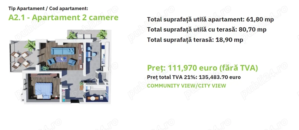C 1556_1 Speed Imobiliare vă propune spre vânzare două tipuri de apartamente cu 2 camere, situate în complexul Green Residence, pe strada Livezeni, în cartierul Tudor. Apartamentele au suprafețe cuprinse între 72.80 și 80.70 mp și vor fi predate în martie 2026, în stadiul finisat complet. Fiecare apartament este dotat cu centrală proprie, încălzire în pardoseală, geamuri termopan, aer condiționat, balcon generos, ușă de intrare smart și toaletă cu funcții inteligente. Blocul este construit din cărămidă, izolat la exterior cu polistiren de 10 cm, și dispune de două ascensoare. Complexul este supravegheat video, asigurând un nivel ridicat de confort și siguranță. Locurile de parcare sunt disponibile la prețul de 5.000 euro + TVA (21%). Prețul de vânzare al apartamentelor este de 135.483 euro (TVA inclus), iar comisionul către agenție este 0%. Se acordă un discount de 5% pentru achitarea integrală a prețului în momentul semnării primului contract de vânzare-cumpărare, respectiv un discount de 2,5% pentru achitarea a 50% din preț în avans și 50% la semnarea contractului de vânzare-cumpărare final. Structura de rezistență a imobilelor este alcătuită din fundații de beton armat tip radier general și sistem constructiv în cadre din beton armat format din stâlpi, grinzi și planșee din beton armat, precum și diafragme, scări și atice din beton armat monolit. Regim de înălțime P+10 etaje. Planșeele au o grosime de 20 cm, iar înălțimea utilă a etajului curent este de 2,6 m. Fiecare apartament beneficiază de balcoane generoase tip terasă (conform specificațiilor fiecărui tip de apartament). Zidăria exterioară: Zidăria exterioară este din termoizolant YTONG. Peretrii exteriori sunt izolați cu un termosistem din polistiren expandat de 10 cm, peste care se aplică o masă de spaclu armata cu fibră de sticlă, urmată de tencuiala decorativă texturată în culorile alb și roșu. Peretii despărțitori dintre apartamente și spațiile comune sunt din zidărie termoizolantă cu grosime de 25 cm și diafragme de beton de 25 cm, iar pereți exterior din zidărie termoizolantă de 30 cm. Peretii neconstructivi (pentru compartimentările interioare) au grosimea între 20-25 cm. Tencuiala și vopseaua sunt lavabile, iar închiderea firidelor pentru instalații este realizată cu un sistem din gips-carton și izolație din vată minerală de 5 cm pentru confortul acustic. Tâmplărie exterioară: Tâmplăria exterioară este din profile Veka, pachet sticlă tripan, profile cu 6 camere si cu barieră termică oferind o izolație termică și fonică de cea mai bună calitate, culoare Antracit. Glafurile exterioare sunt din tablă în culoarea fațadei. Terasele Balcoanele: Terasele sunt hidro și termoizolate, finisate în culorile fațadei, și pardosite cu plăci ceramice de înaltă calitate, au iluminat Led cu senzor de mișcare și prize. Balustrada de protecție este din inox cu parapet din panouri de sticlă, având înălțimea de 110 cm. Clădirea beneficiază de un sistem de supraveghere video a perimetrului clădirii, acces în immobile și parcare. Totodată accesul la etajele superioare se realizează cu 2 ascensoare de capacitate de 6 persoane fiecare, greutate maximă 630 kg. Fiecare apartament beneficiază de un loc de parcare exterior neinclus în preț ofertă. Finisaje generale: Ușa de intrare în apartament: Ușă HPL vopsit de grosime 5.2 cm cu închidere multipunct SMART (deschidere prin amprentă, recunoaștere facial, cod sau cheie), include un sistem SMART de video sonerie, izolată fonic, maner Gun Grey, toc și pervaz MDF vopsit până în tavan. Uși interioare: Uși moderne, lisse (pline), din MDF vopsit, grosime de 40mm, cu toc reglabil, pervaze pe ambele părți, 3 balamale reglabile, garnitură, broască și maner negru de calitate superioara. Utilități: Apartamentele sunt contorizate individual și sunt racordate la rețeaua electrică și de gaze naturale. Conexiune la rețeaua de fibră optică (FTTH – fiber-to-the-home) prin rețeaua DIGI. Instalații termice: Fiecare apartament dispune de o centrală termică proprie în condensare Ariston 25KW, cu încălzire în pardoseală. Centralele în condensare oferă un consum redus de energie, cu până la 30% mai puțin față de o centrală standard, datorită randamentului mai ridicat. Finisaje interioare: Holuri: Peretii și tavanele sunt zugrăvite în alb cu vopsea lavabilă, iar pardoseala este placată cu parchet laminat de înaltă calitate. Fiecare apartament este dotat cu distribuitor-colector pentru încălzire în pardoseală, tablou electric, comutator si 2 termostate. Bucătării: Peretii sunt zugrăviți în alb. Pardoseala este placată cu parchet laminat. Bucătăriile sunt dotate cu centrală termică, încălzire în pardoseală, instalație de gaze, senzori de gaze, prize simple și duble. Livinguri: Peretii și tavanele sunt finisate cu glet și zugrăvite în alb. Pardoseala este din parchet laminat de 10 mm grosime. Livingurile sunt dotate cu, instalație TV, prize internet și prize TV. ID anunț: 1762865610