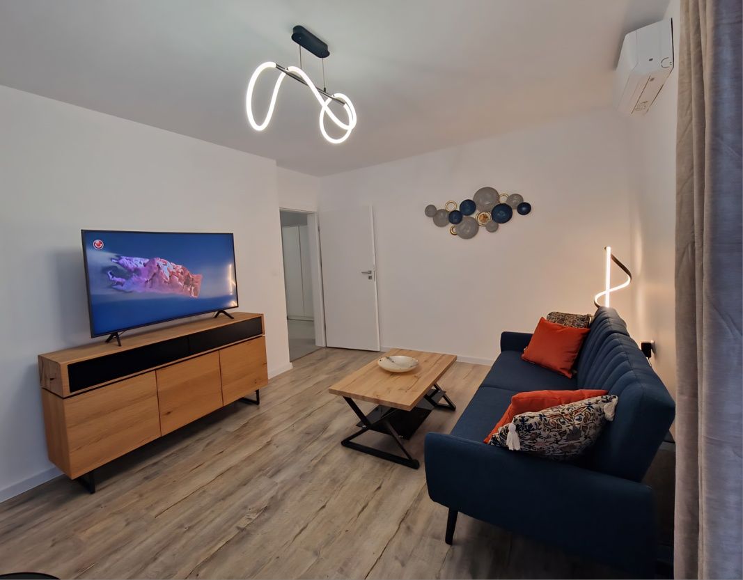Închiriez apartament 2 camere nou, la prima închiriere, cu încălzire în pardoseală. Se află la etajul 5 din 8 și are un balcon de 4 mp, acoperit. Apartamentul este complet decomandat, mobilat si utilat pentru pretențioși, astfel: